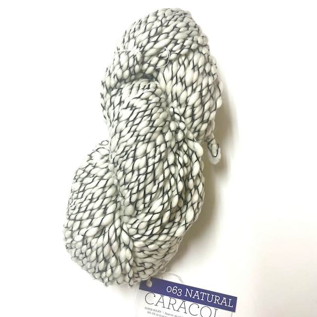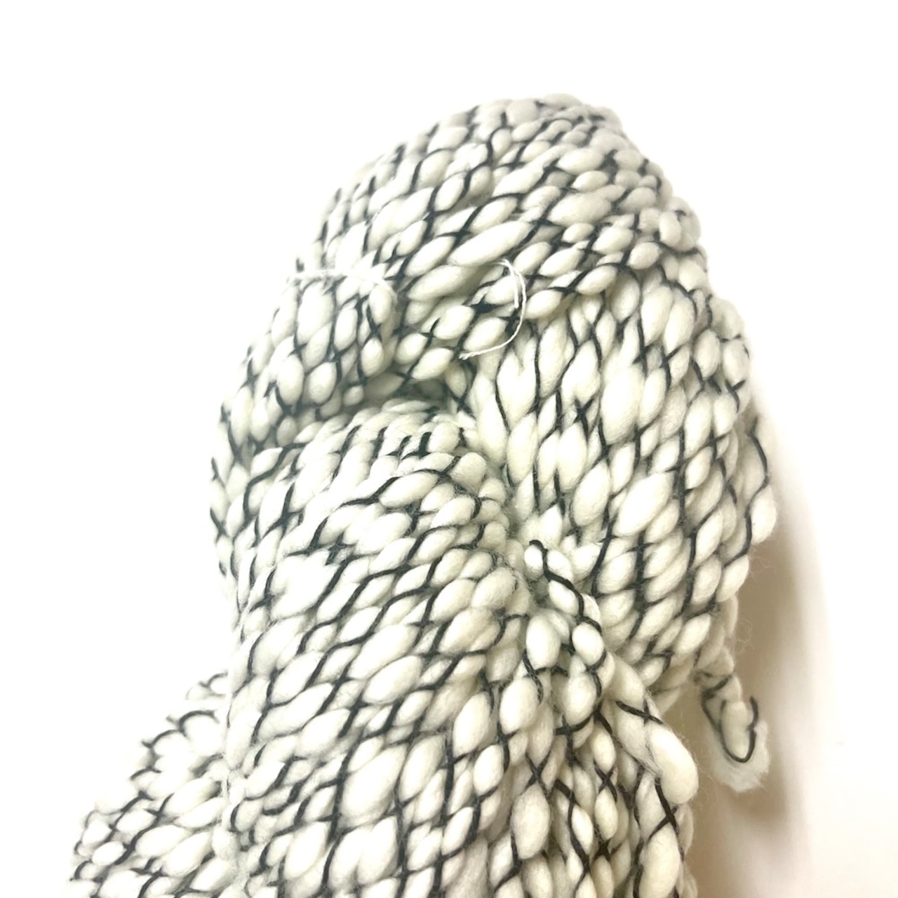 糸自体が「太い部分と細い部分」が混ざった独特の太さで、そこに黒や白の糸を交差させてテクスチャーを出す構造になっています。このため、ふんわりしたボリューム感と立体感のある編み地になります。